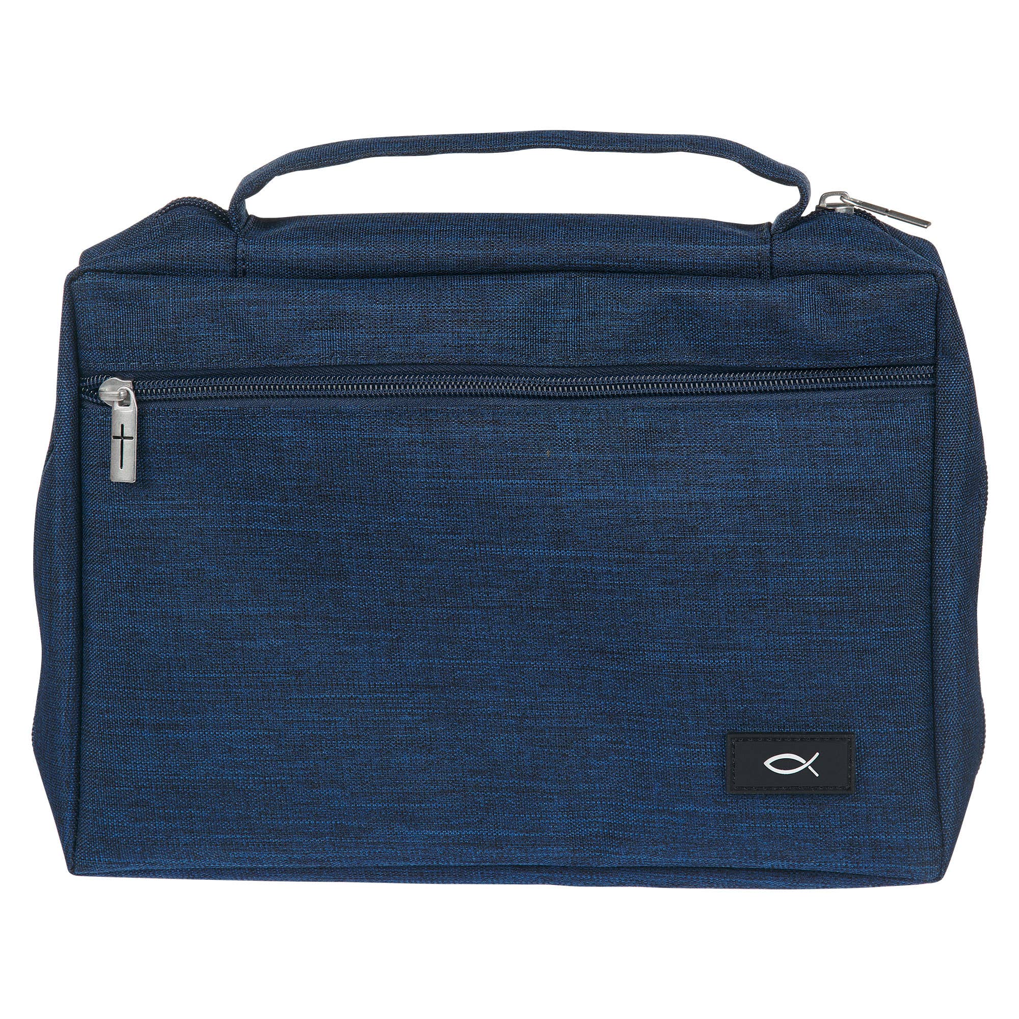 Protect your Bible with the Navy Blue Poly-canvas Value Bible Cover with Ichthus Patch. This affordable yet durable Bible case is the ultimate solution to safeguard your most treasured possession from the rigors of daily use.  Black rubberized appliquéd patch with white Ichthus fish design, Navy blue poly-canvas, Poly-canvas material, Front zippered pocket, 2 brushed-silver cross-engraved zipper pulls, 2 elastic pen loops inside, Lay-flat spine handle, Self-seal bag packaging, Available in four sizes, Small, medium, large and extra-large, Refer to Image Carousel for Bible Cover Sizing Chart