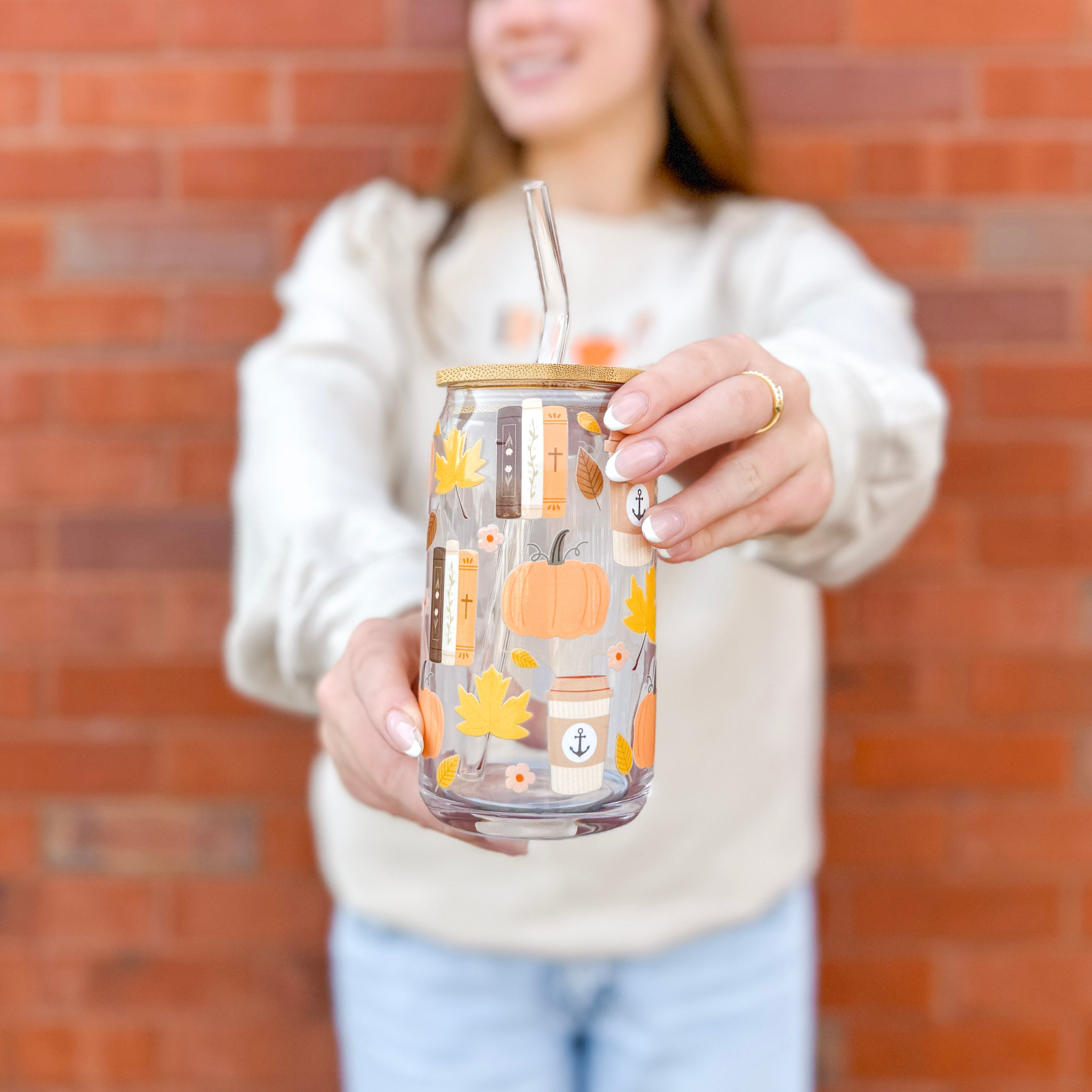 This adorable Pumpkin spice and Bible print glass cup is perfect for your iced coffee, tea or water! Pretty Bibles, pumpkins and fall leaves truly remind you He is faithful in every season! Carry this fun reminder with you wherever you go!