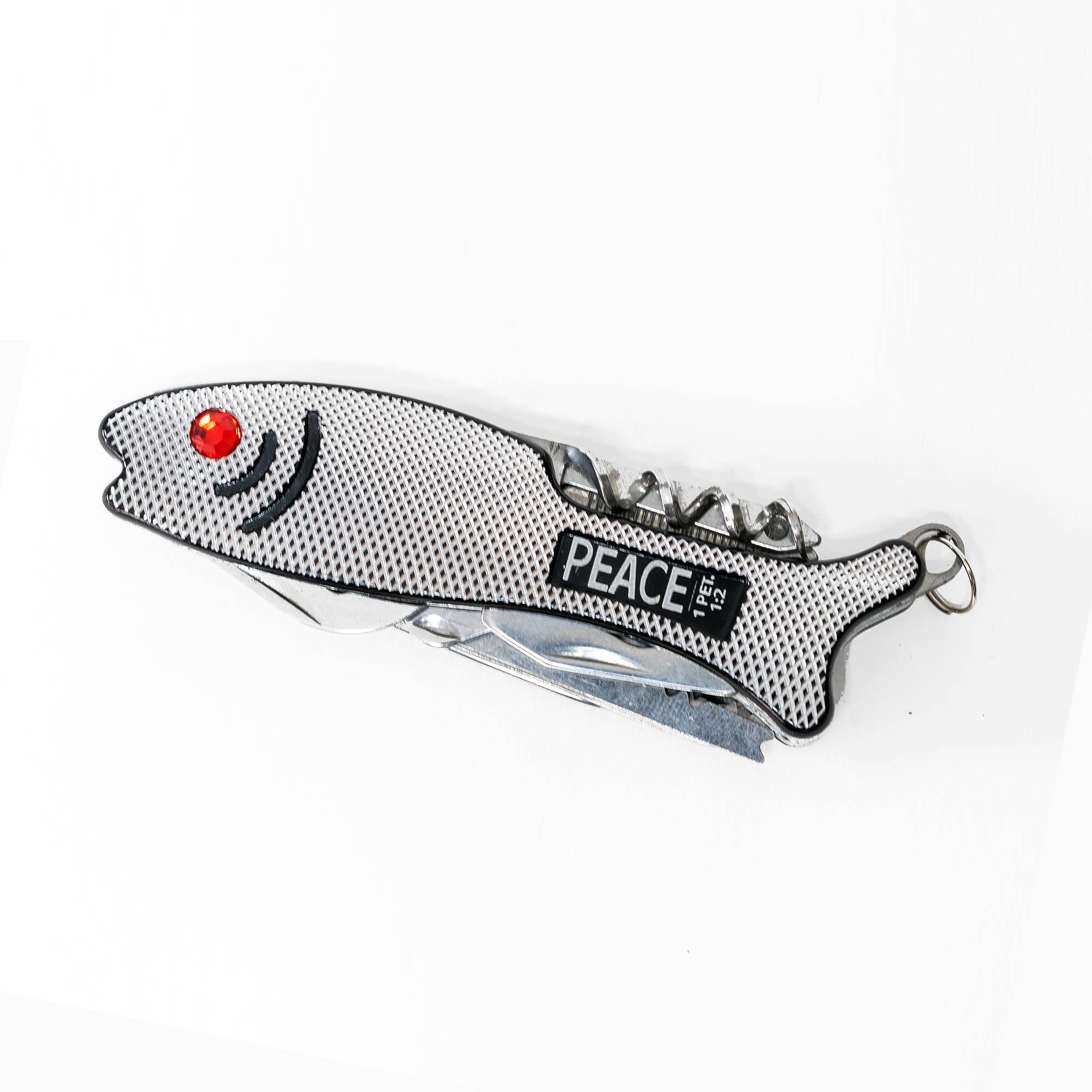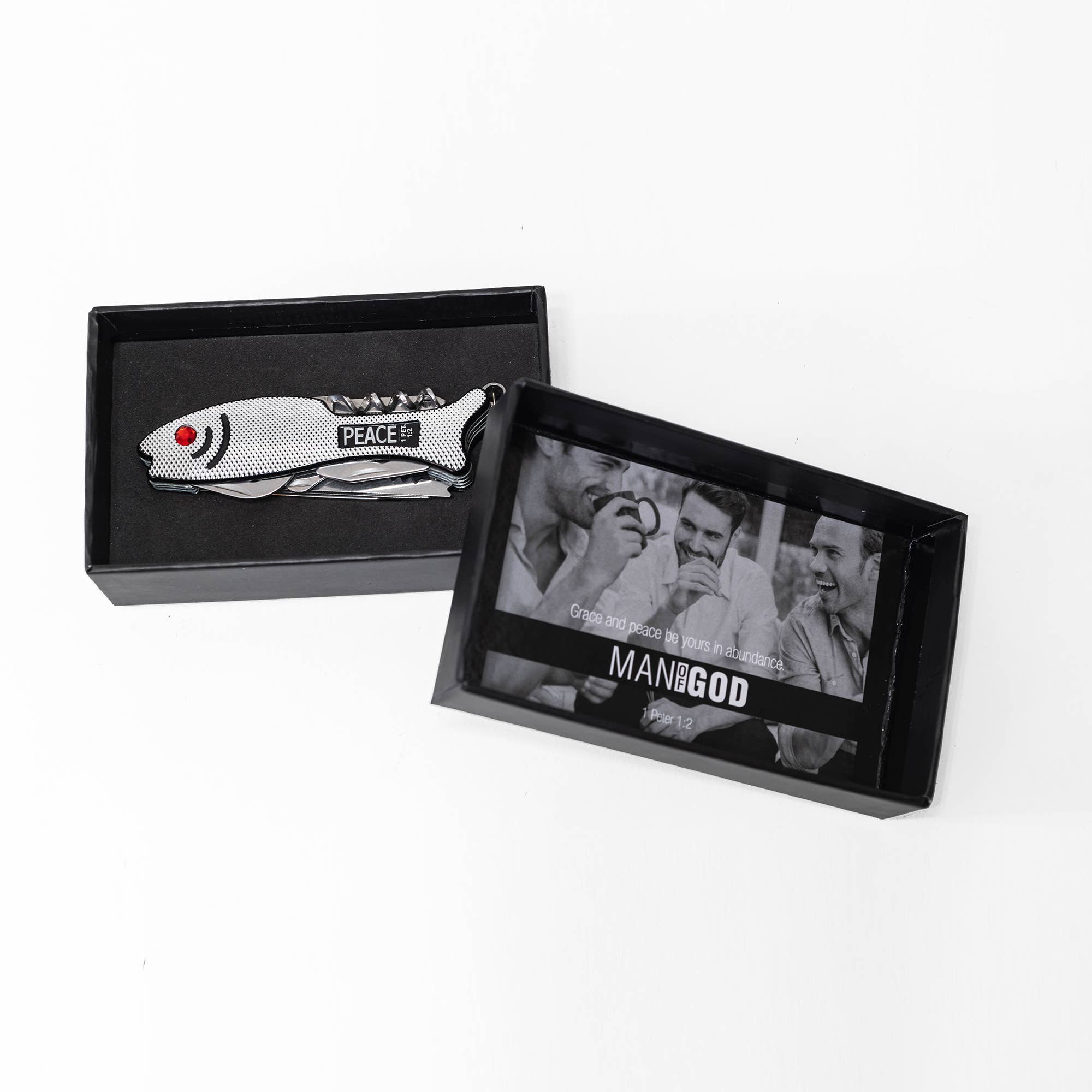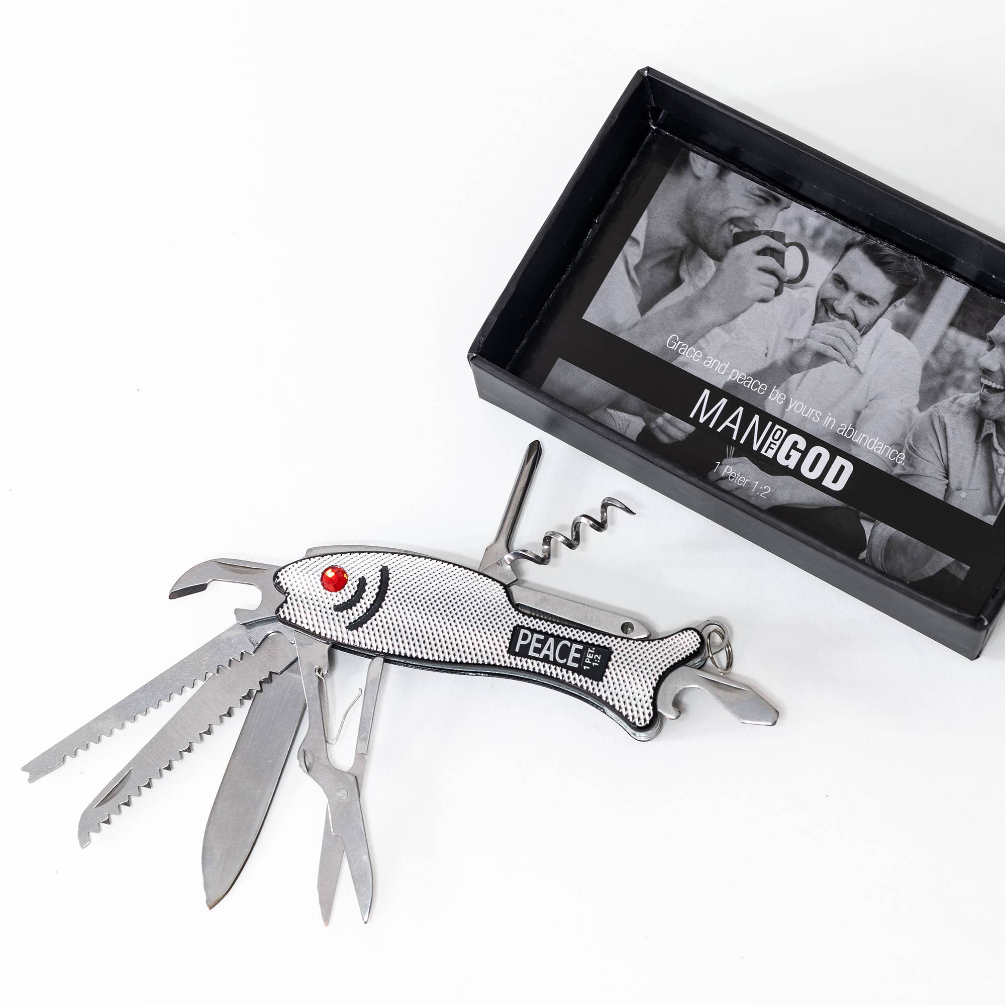 Scripture: Word of God. No tackle box needed for this awesome fish shaped multi tool! Saw, slice, cut, and file on or off the boat. Small and compact for easy pocket storage. Includes bottle opener, corkscrew wine opener, & Philips head screwdriver also included.