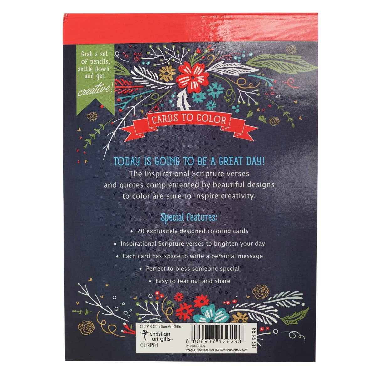 Grab a set of colored pencils settle down and get creative! Here is an idea for fun, relaxing way to unwind. The Today Is Going To Be A Great Day Coloring Postcards can be used for anti-stress therapy and biblical inspiration. This collection of coloring cards is compiled of inspirational Scripture verses and quotes complemented by beautiful designs to color and bring your creativity to life.  Set of Inspirational Postcards to Color, Postcard-size Booklet, 20 Tear-out Cards, Easy Tear-out Cards, Printed Line-art on One Side, Space To Address Note On Back Shrinkwrap packaging, Size: 6.5" x 4.7" x .4" (165 x 119 x 10mm)