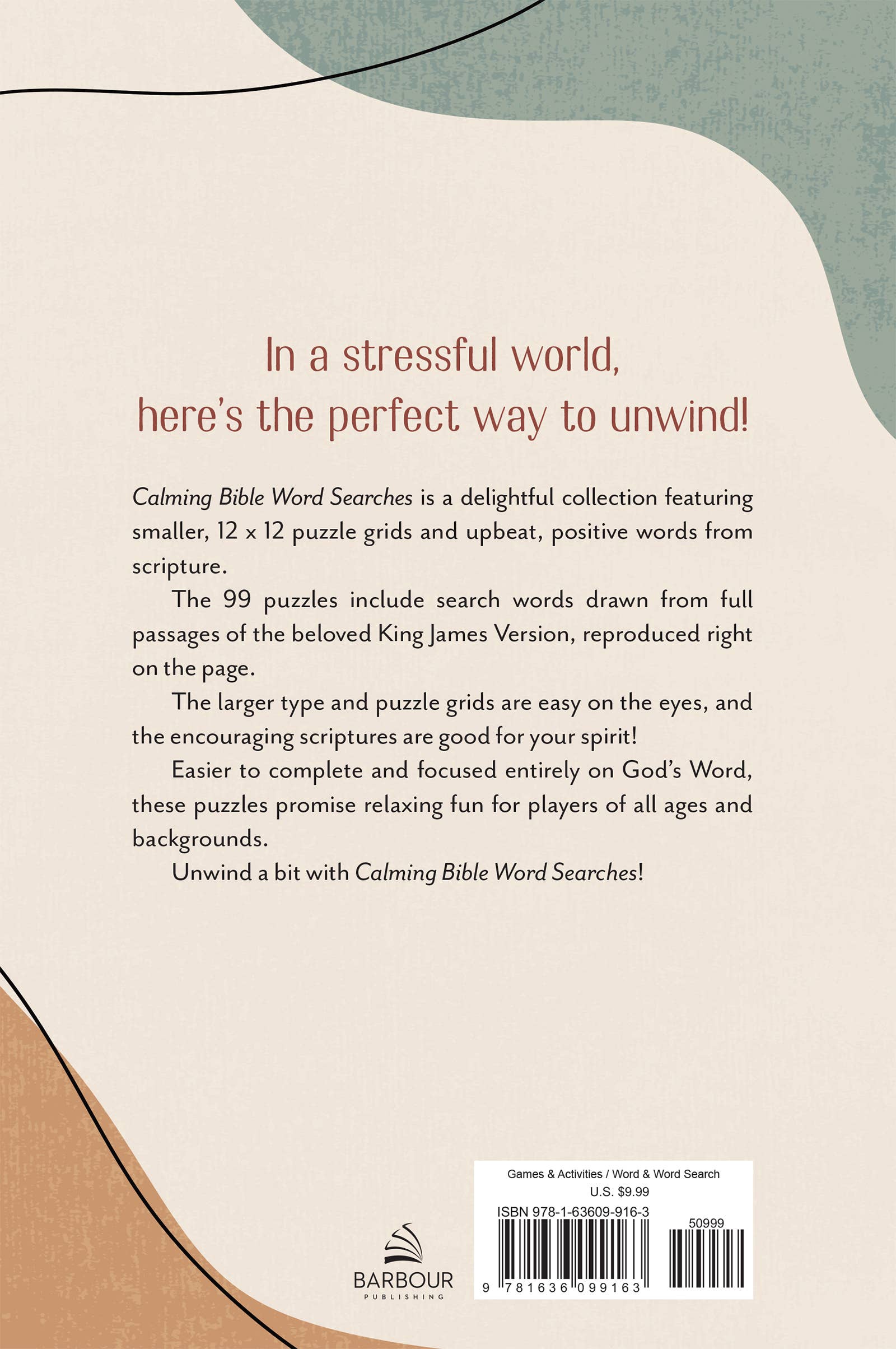 In a stressful world, here’s the perfect way to unwind! Calming Bible Word Searches is a brand-new collection featuring smaller, 12 x 12 puzzle grids and upbeat, positive words from scripture. The 99 puzzles include search words drawn from full passages of the beloved King James Version, reproduced right on the page. The larger type and puzzle grids are easy on the eyes, and the encouraging scriptures are good for your spirit! Easier to complete and focused completely on God’s Word, these puzzles promise relaxing fun for players of all ages and backgrounds. Chill a bit with Calming Bible Word Searches!